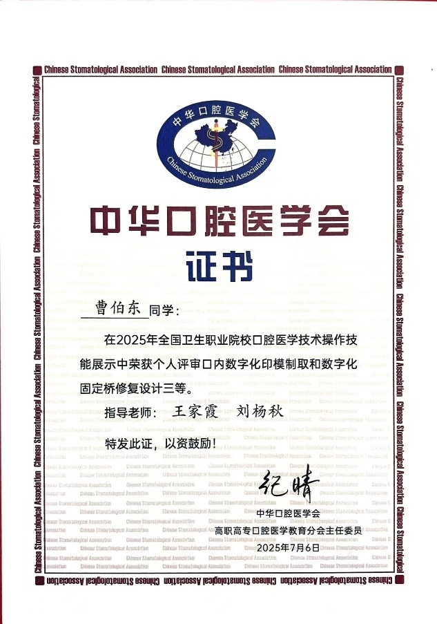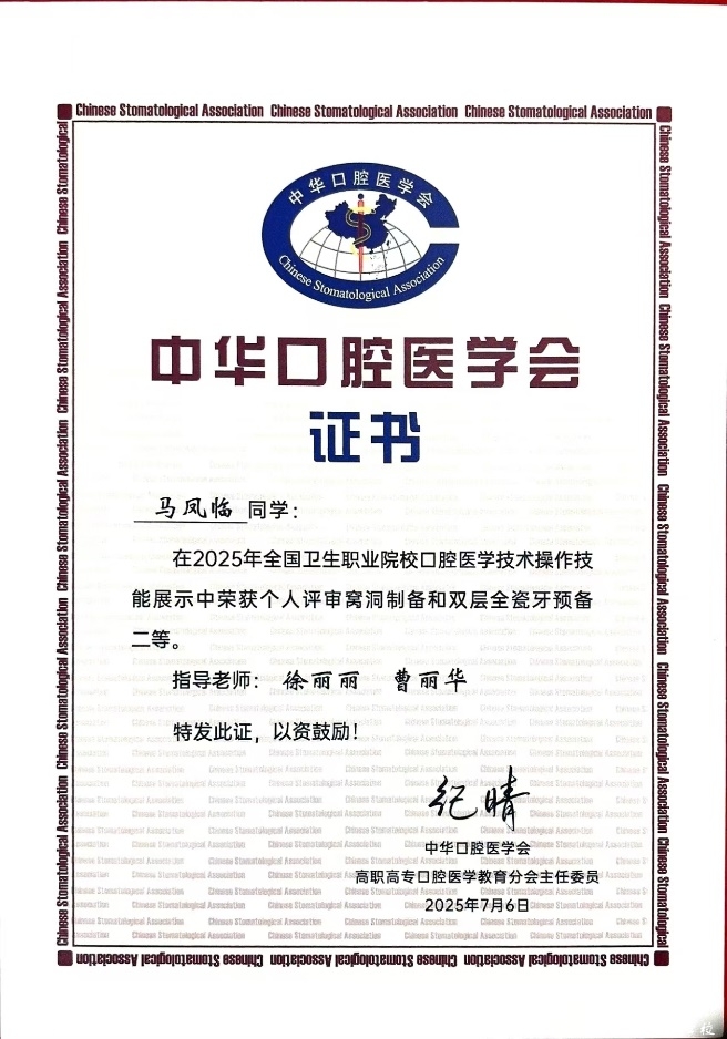 本次大赛由中华口腔医学会高职高专口腔医学教育分会主办、苏州卫生职业技术学院承办,是全国卫生职业院校口腔领域的重要赛事,吸引了来自全国70余所院校180余名顶尖选手同台竞技。我校学生马凤临和曹伯东凭借扎实的专业功底和稳定的心理素质,分获窝洞制备和双层全瓷牙预备二等奖、口腔数字化修复三等奖。