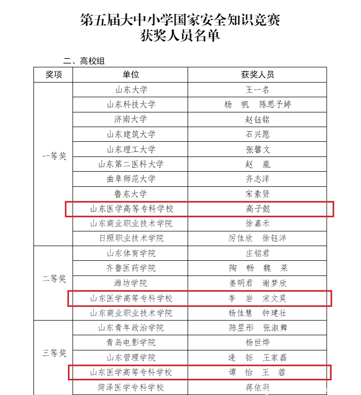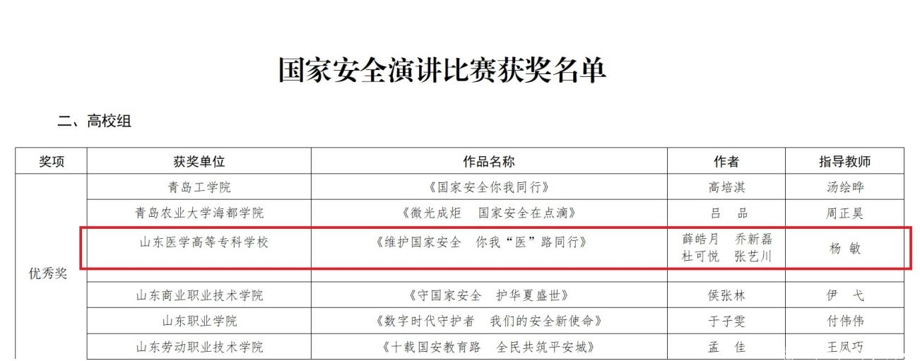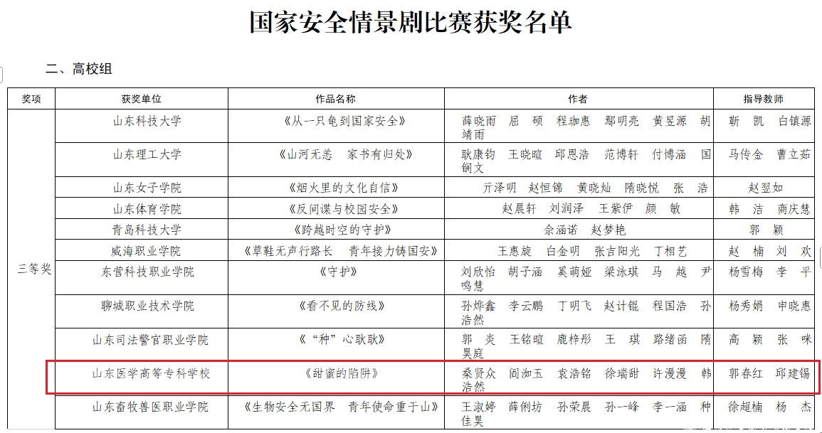 近日,山东省教育厅公布2025年国家安全宣传教育系列活动结果,山东医学高等专科学校获得国家安全知识竞赛一等奖、二等奖、三等奖各1项,国家安全情景剧和国家安全演讲比赛三等奖和优秀奖各1项。