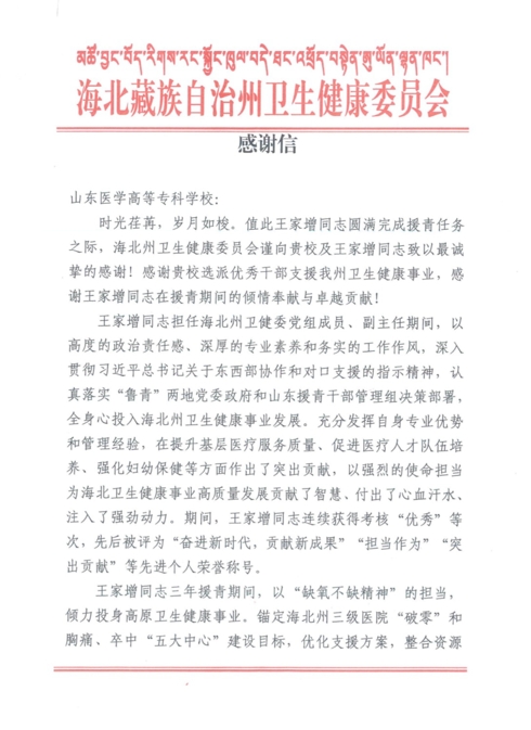 近日,山东医学高等专科学校收到了一封来自海北藏族自治州卫生健康委员会的感谢信,信中表达了对学校的感谢并高度赞扬了援青干部王家增同志,感谢学校选派优秀干部支援海北州卫生健康事业,感谢王家增同志在援青期间的倾情奉献与卓越贡献!
