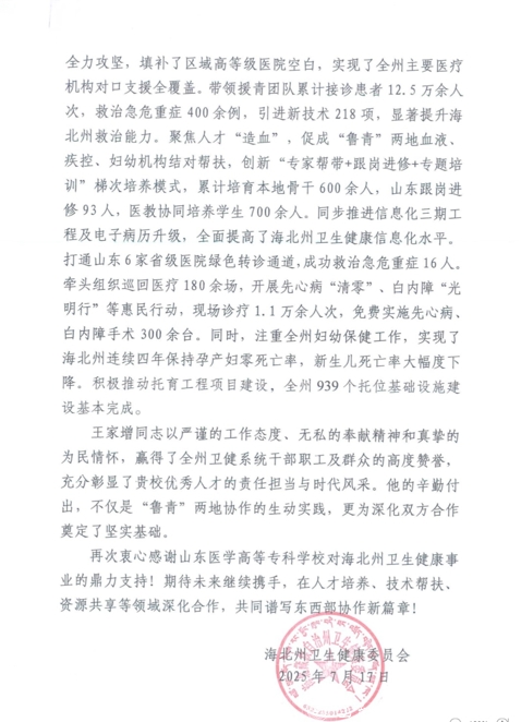 感谢信提到,王家增同志三年援青期间,以“缺氧不缺精神”的担当,倾力投身高原卫生健康事业。锚定海北州三级医院“破零”和胸痛、卒中“五大中心”建设目标,优化支援方案,整合资源全力攻坚,填补了区域高等级医院空白,实现了全州主要医疗机构对口支援全覆盖,显著提升海北州救治能力。聚焦人才“造血”,促成“鲁青”两地血液、疾控、妇幼机构结对帮扶,创新“专家帮带+跟岗进修+专题培训”梯次培养模式。同步推进信息化三期工程及电子病历升级,全面提高了海北州卫生健康信息化水平。打通山东6家省级医院绿色转诊通道,开展先心病“清零”、白内障“光明行”等惠民行动,重视全州妇幼保健工作,积极推动托育工程项目建设等。作为一名援青干部,王家增同志以严谨的工作态度、无私的奉献精神和真挚的为民情怀,赢得了海北州卫健系统干部职工及群众的高度赞誉,充分彰显了新时代优秀干部的责任担当与时代风采。