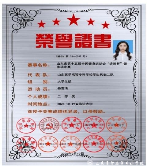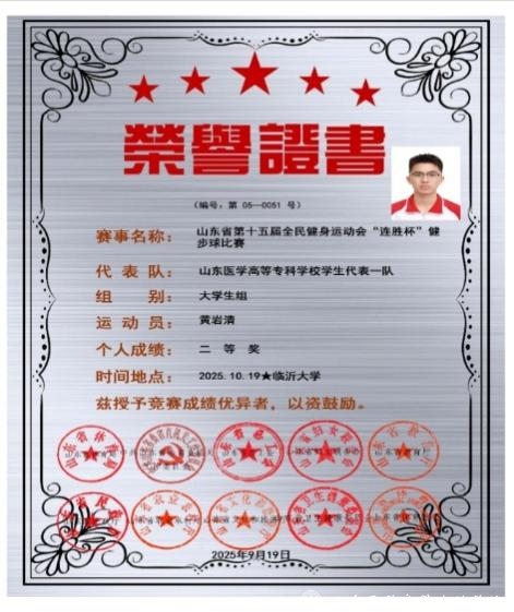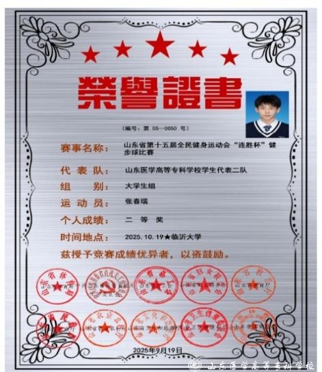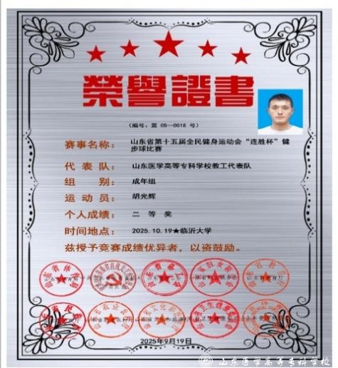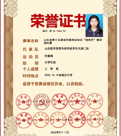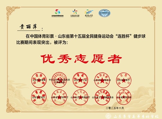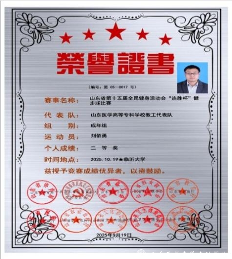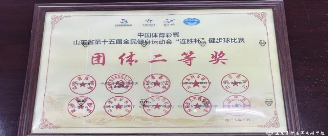 近日,山东医学高等专科学校代表队在山东省第十五届全民健身运动会“连胜杯”健步球比赛中凭借出色的表现和稳定的发挥获团体二等奖1项,个人二等奖7项,24人获“优秀志愿者”称号。