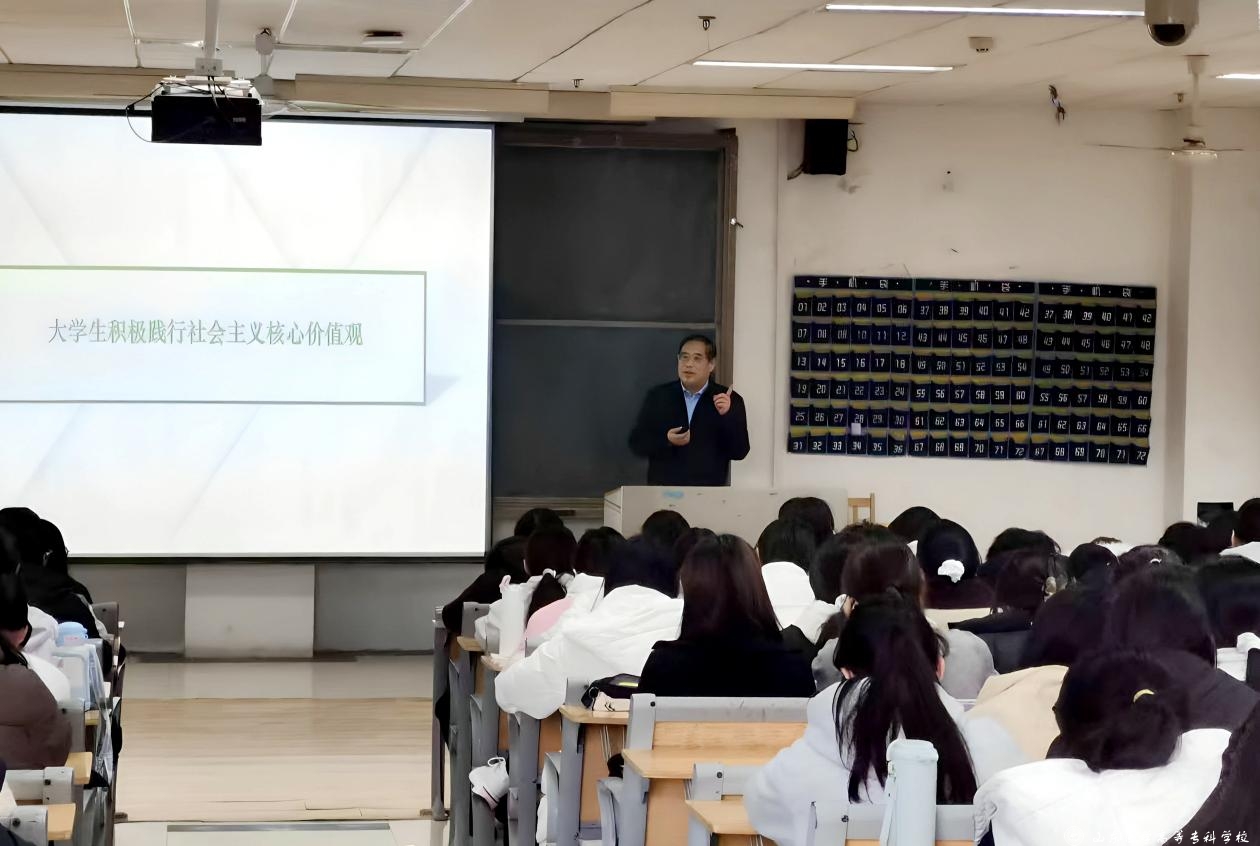 学校党委委员、副校长程智军为2025级护理专业学生讲授题为“大学生积极践行社会主义核心价值观”的思政课。他从社会主义核心价值观的时代内涵、现实意义、实践路径三个维度展开系统阐释,社会主义核心价值观凝结着全体人民共同的价值追求,是当代中国精神的集中体现,更是青年一代成长成才的根本遵循。面对世界百年未有之大变局,他鼓励青年学子将个人理想融入国家发展和民族复兴伟业,在时代浪潮中找准定位、实现价值。