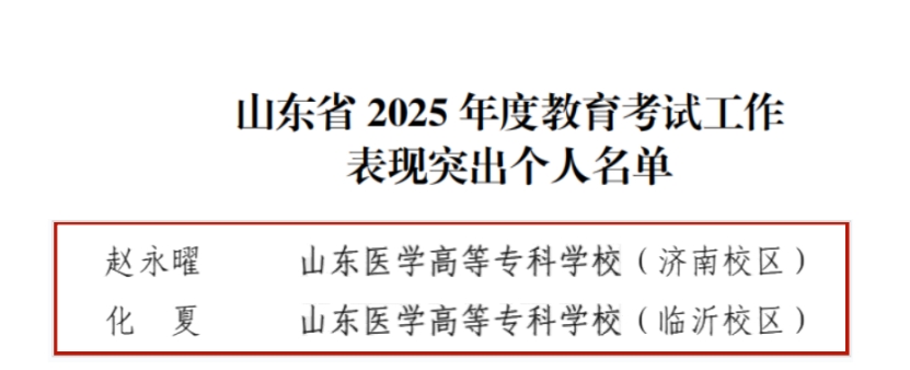 近日,山东省教育厅对在2025年度高等学校教育考试工作中表现突出的单位和个人予以通报表扬,山东医学高等专科学校赵永曜、化夏获“山东省2025年度教育考试工作表现突出个人”。