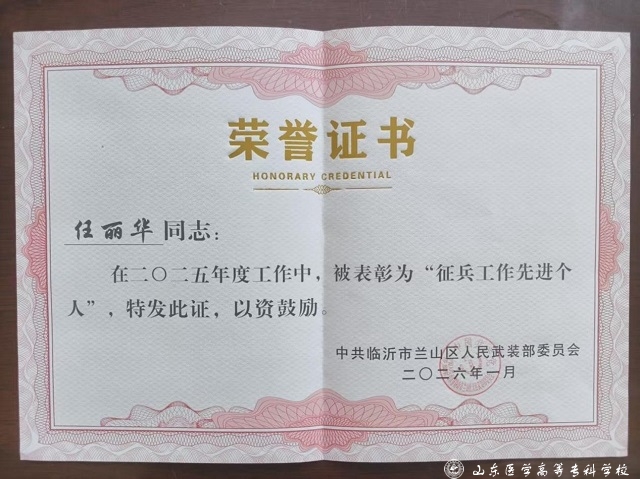 近日,济南市市中区国防动员委员会、临沂市兰山区人民武装部分别发布表彰通报,山东医学高等专科学校获评征兵工作表现突出单位,任丽华同志荣获“征兵工作先进个人”称号。